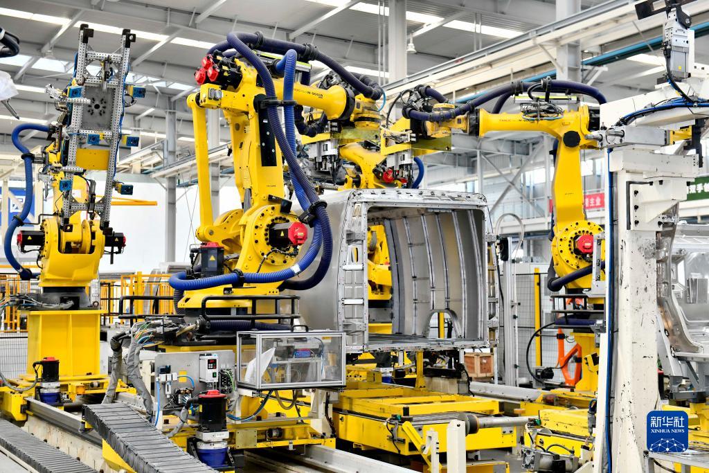 9月13日,在山東鄒平魏橋輕量化基地宏奧全鋁車(chē)身集成生產(chǎn)車(chē)間,工業(yè)機器人在流水線(xiàn)上作業(yè)。
