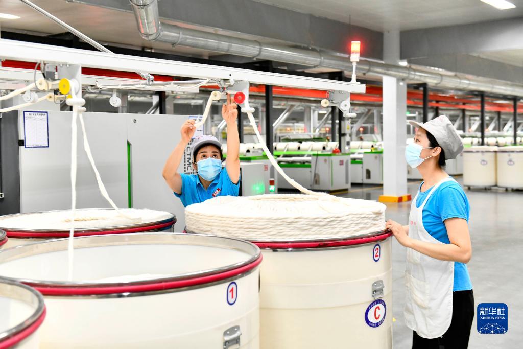 9月13日,在山東宏儒紡織科技有限公司綠色智能化生產(chǎn)車(chē)間,工作人員在加工高端紗線(xiàn)。