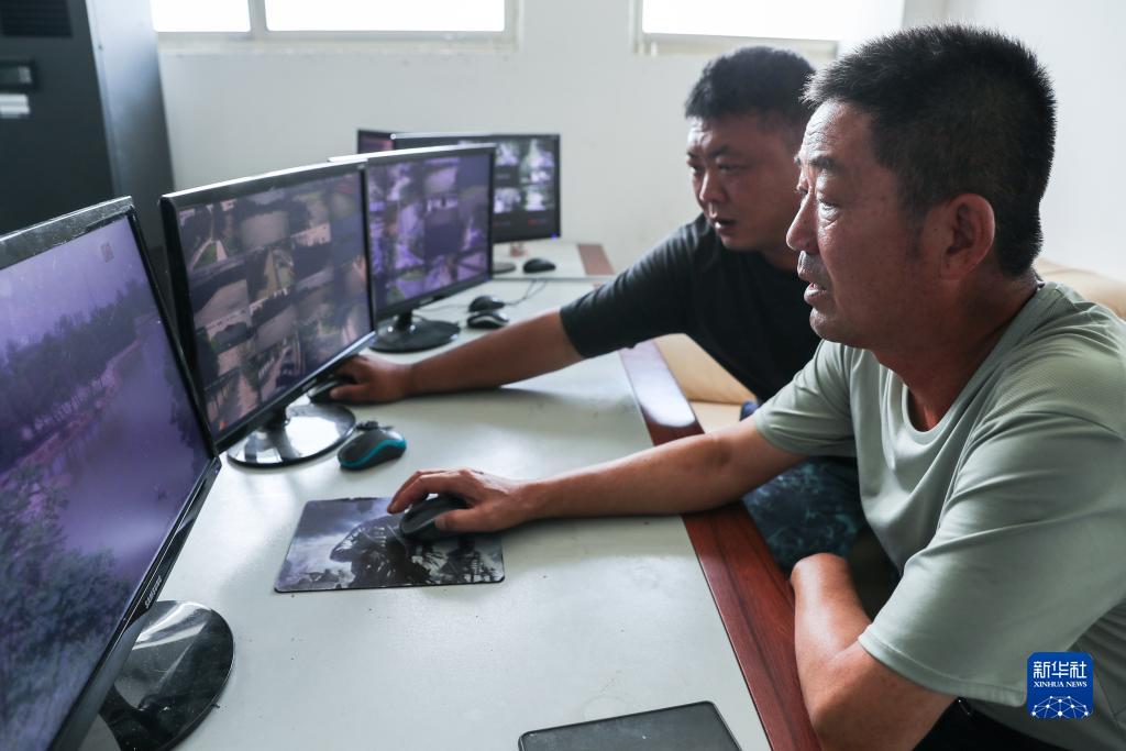 徐安宏(右)在監控室里觀(guān)察麋鹿情況(2023年8月21日攝)。新華社記者 楊磊 攝