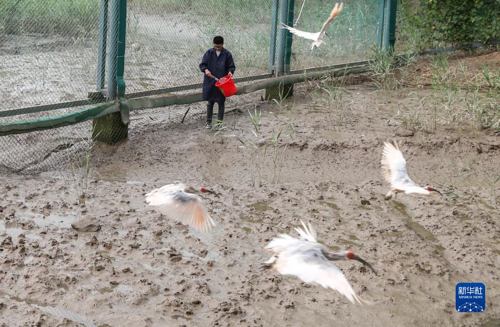 蔡新杰在給朱鹮投放食物(2023年8月21日攝)。新華社記者 楊磊 攝