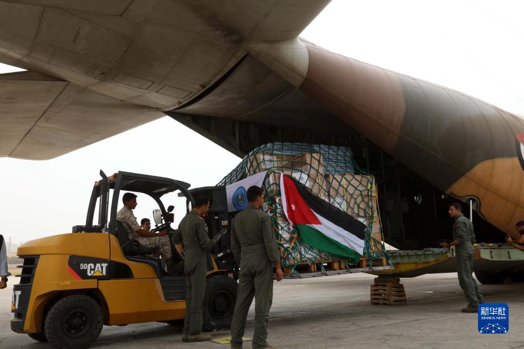 9月13日,工作人員在約旦安曼一軍用機場(chǎng)搬運援助物資。