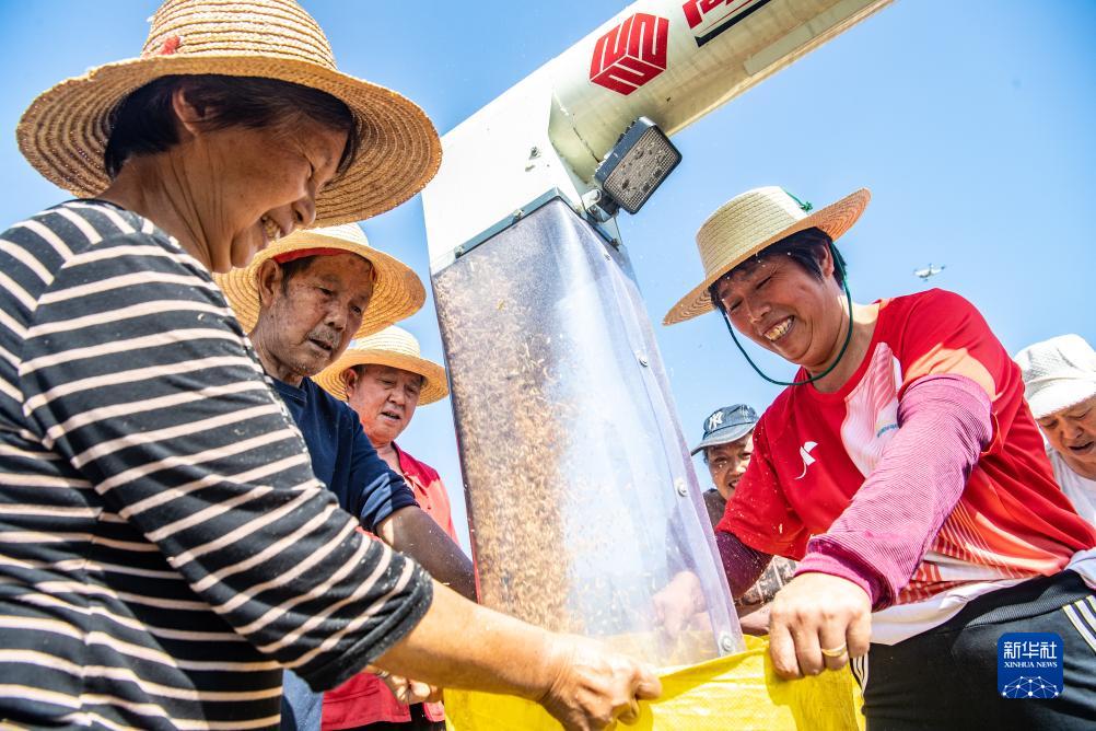 9月14日,稻農在稻田里將剛收割的水稻裝袋。