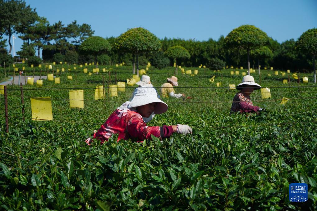 9月14日,在山東省諸城市桃林鎮,茶農在茶園里采摘秋茶。
