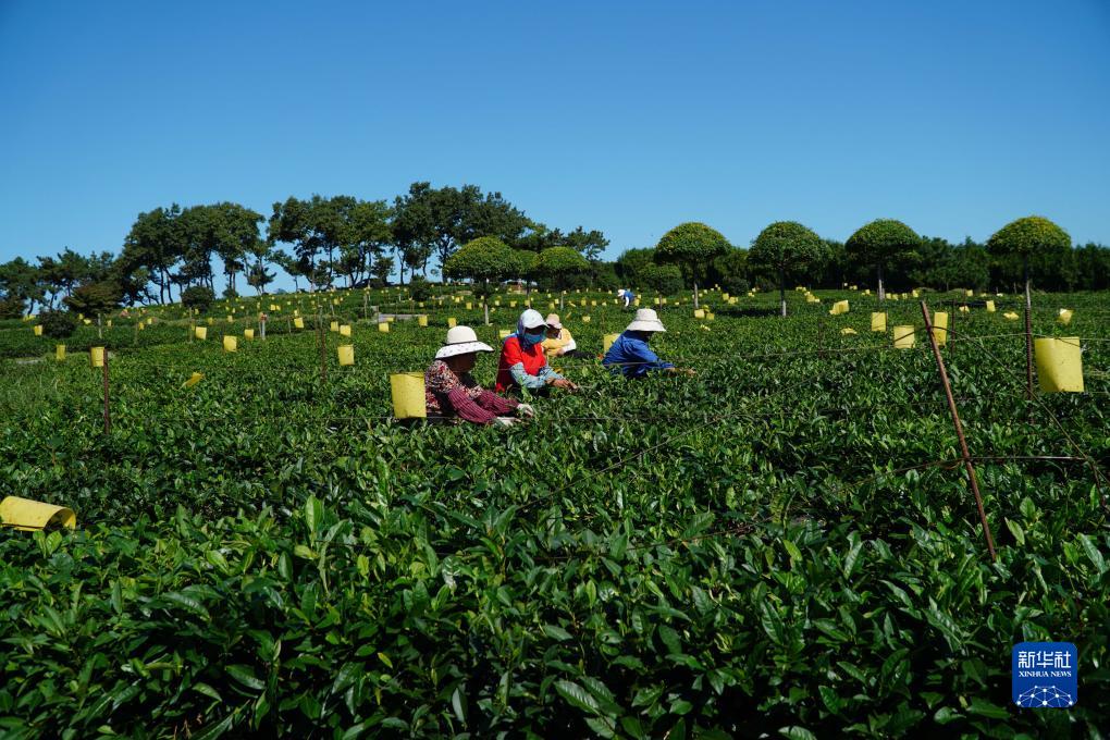 9月14日,在山東省諸城市桃林鎮,茶農在茶園里采摘秋茶。