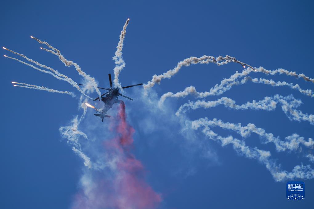 9月14日,在第六屆中國天津國際直升機博覽會(huì )開(kāi)幕式上,陸軍“風(fēng)雷”飛行表演隊直-10武裝直升機發(fā)射干擾彈。