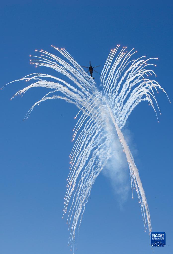 9月14日,在第六屆中國天津國際直升機博覽會(huì )開(kāi)幕式上,陸軍“風(fēng)雷”飛行表演隊直-20戰術(shù)通用直升機發(fā)射干擾彈。