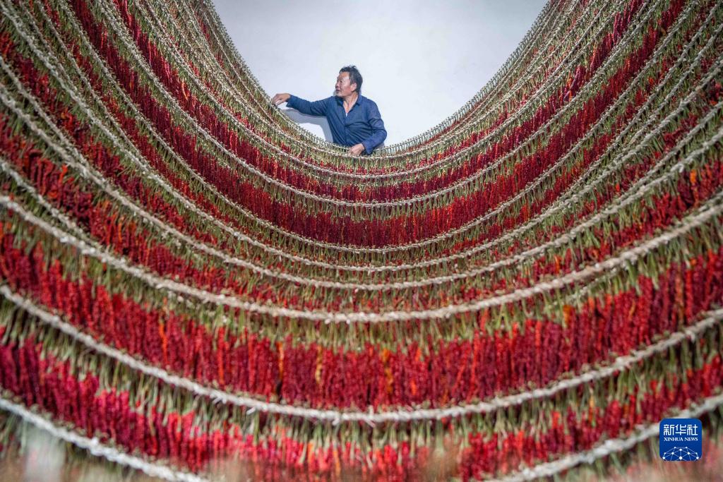 9月13日,村民在貴州省畢節市大方縣理化鄉金雞村查看辣椒烘干情況。
