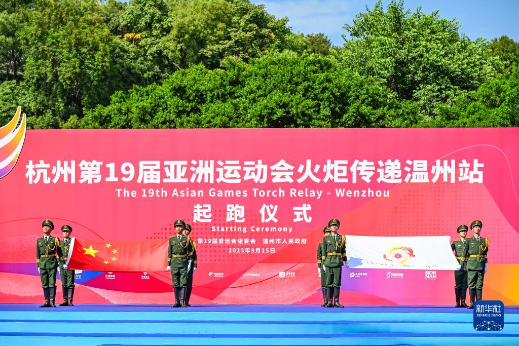 這是杭州亞運會(huì )火炬傳遞溫州站起跑儀式現場(chǎng)(9月15日攝)。