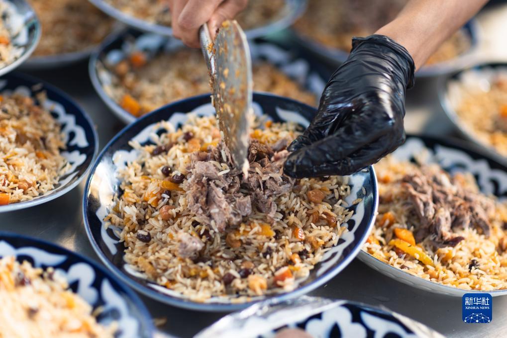 9月13日,在烏茲別克斯坦首都塔什干,工作人員給抓飯裝盤(pán)。