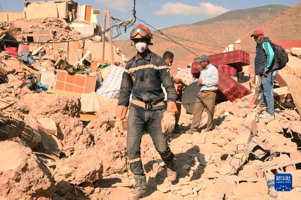 9月14日,救援人員在位于摩洛哥豪茲省的伊姆利勒村的地震廢墟上搜救。