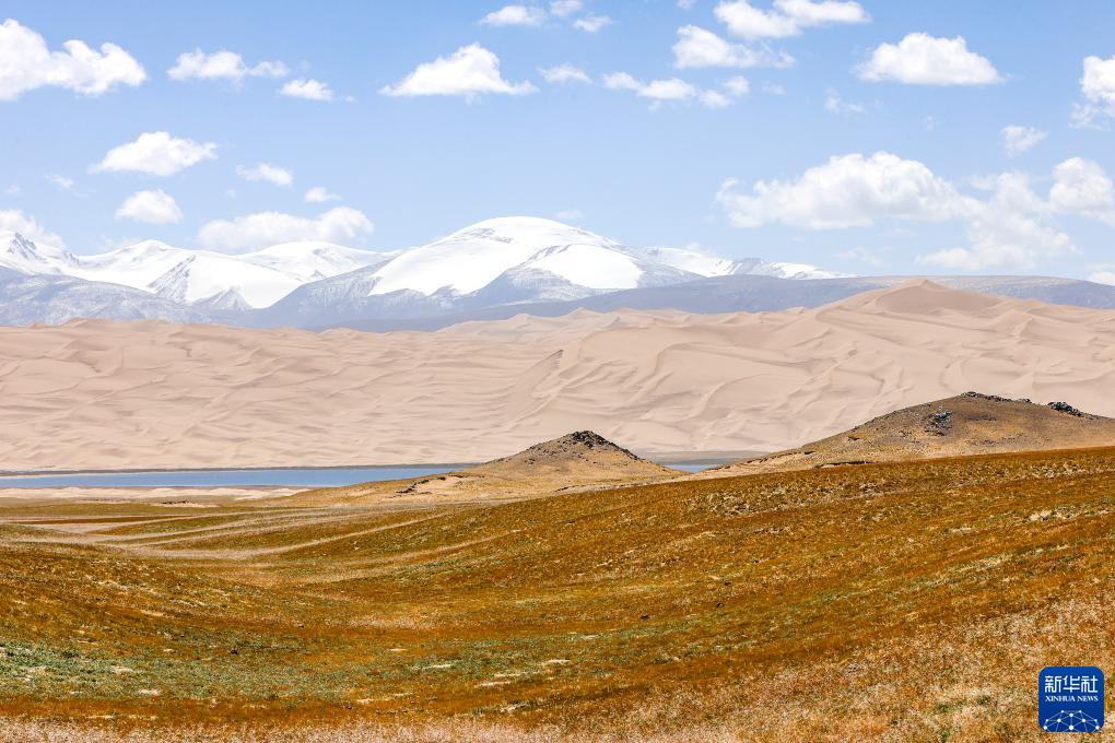 9月12日在阿爾金山國家級自然保護區拍攝的集草原、湖泊、沙漠、雪山于一體的自然景觀(guān)。