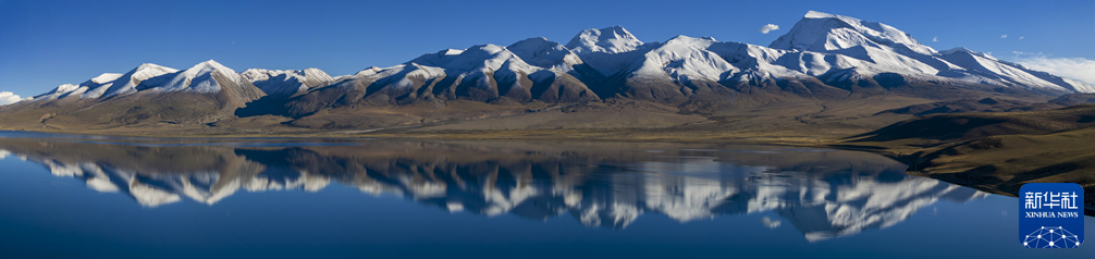 納木那尼雪山倒映在瑪旁雍錯湖面上(無(wú)人機照片,9月13日攝)。