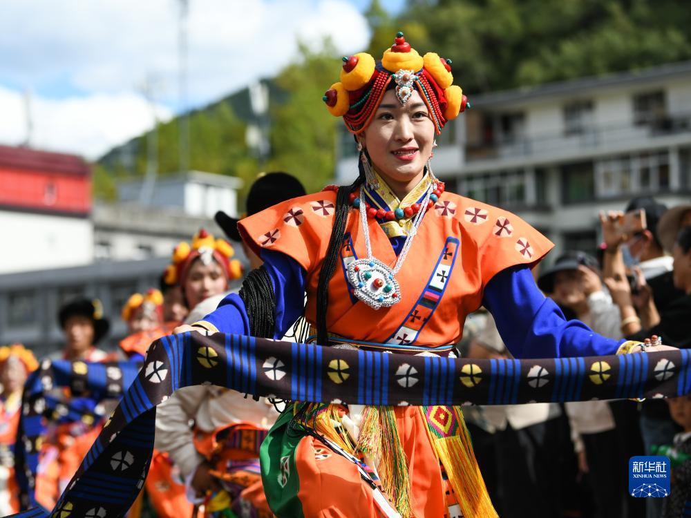 9月15日,在四川省阿壩藏族羌族自治州馬爾康市,演員在街頭表演非遺項目。