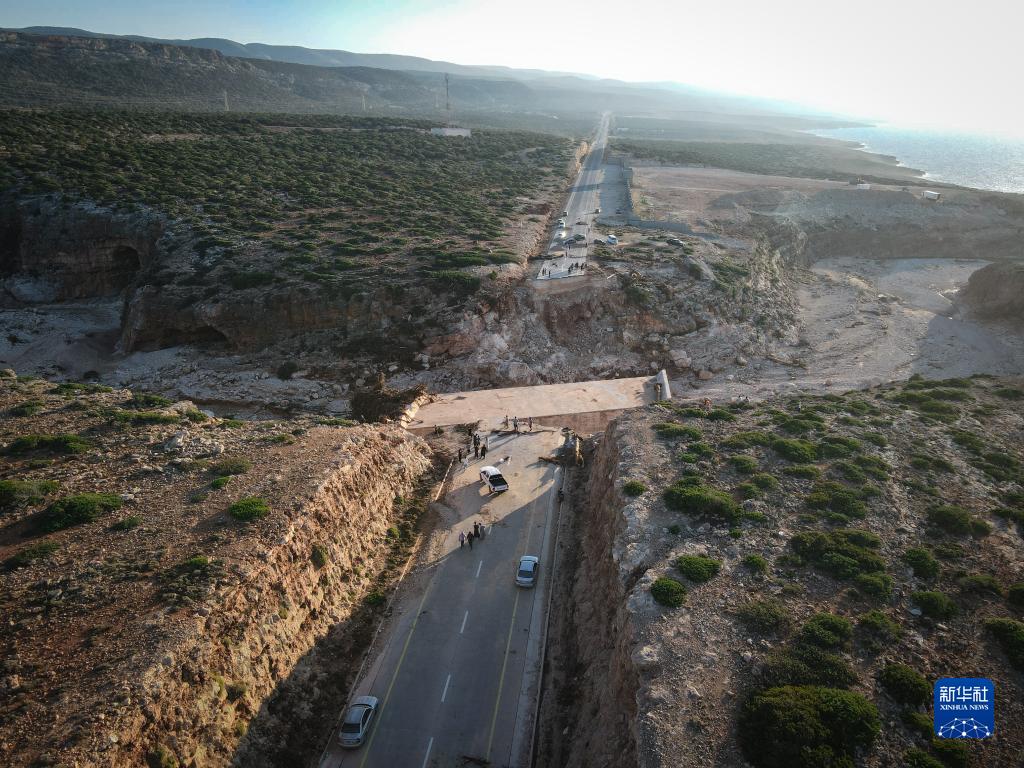 這是9月15日在利比亞?wèn)|部德?tīng)柤{附近拍攝的被毀的橋梁(航拍照片)。