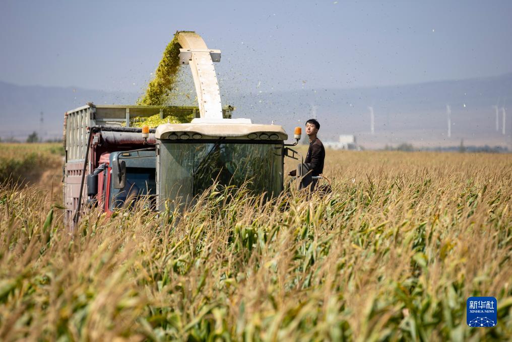 收割機在寧夏吳忠市同心縣韋州鎮現代高效節水灌溉項目建成后的高標準農田收割玉米(9月14日攝)。