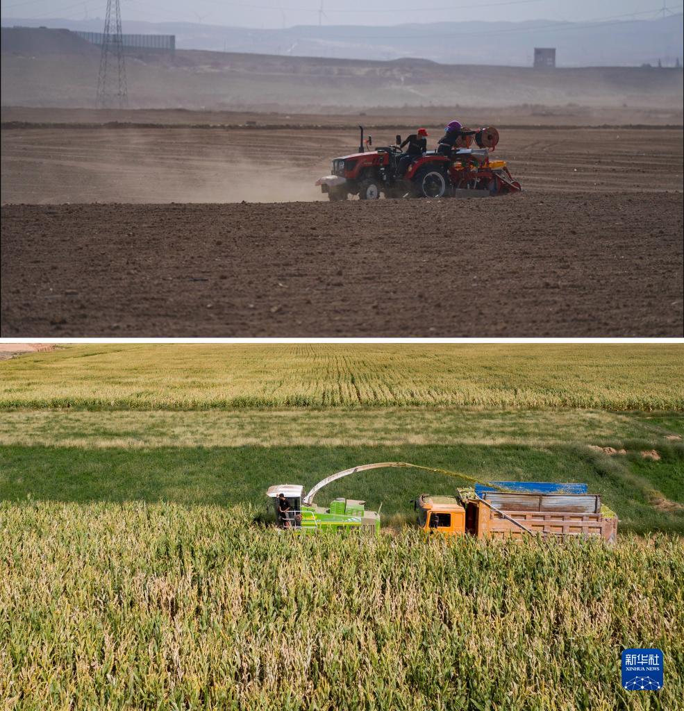 這是一張拼版照片,上圖是農民在寧夏吳忠市同心縣韋州鎮鋪設滴灌帶(資料圖片,2023年4月22日攝);下圖是9月14日拍攝的收割機在寧夏吳忠市同心縣韋州鎮現代高效節水灌溉項目建成后的高標準農田收割玉米(無(wú)人機照片,新華社記者楊植森攝)。