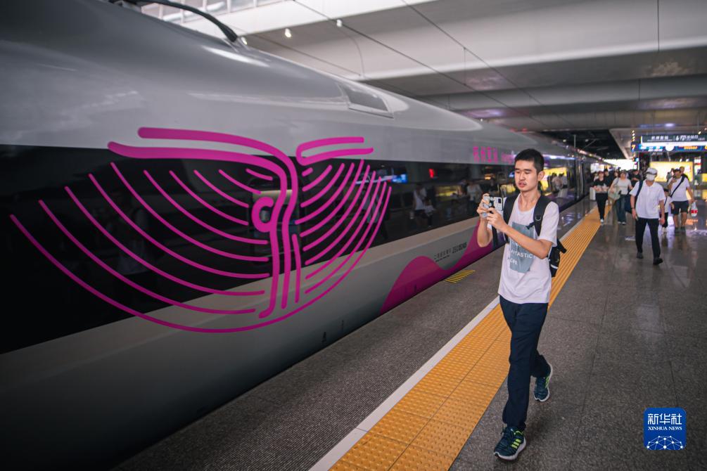 9月16日,乘客在杭州東站站臺拍攝復興號亞運智能動(dòng)車(chē)組列車(chē)。