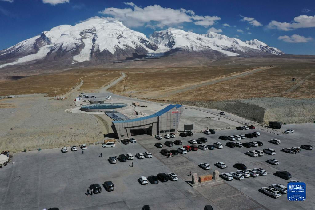 游客來(lái)到新疆塔什庫爾干塔吉克自治縣慕士塔格冰川公園游玩(9月1日攝,無(wú)人機照片)。