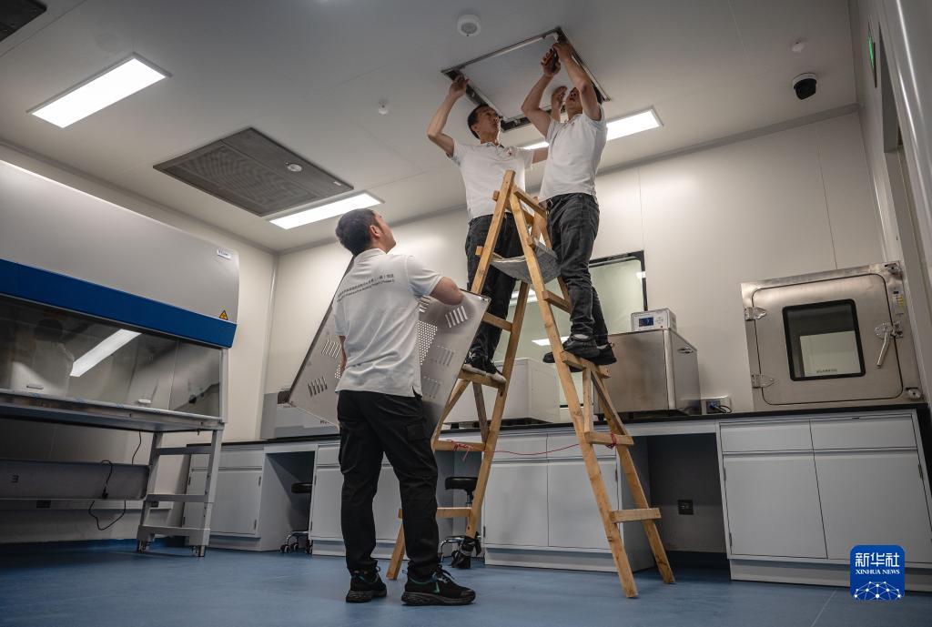 9月11日,中方技術(shù)服務(wù)組成員在埃塞俄比亞首都亞的斯亞貝巴非洲疾控中心待投入使用的p3實(shí)驗室更換高效過(guò)濾器。
