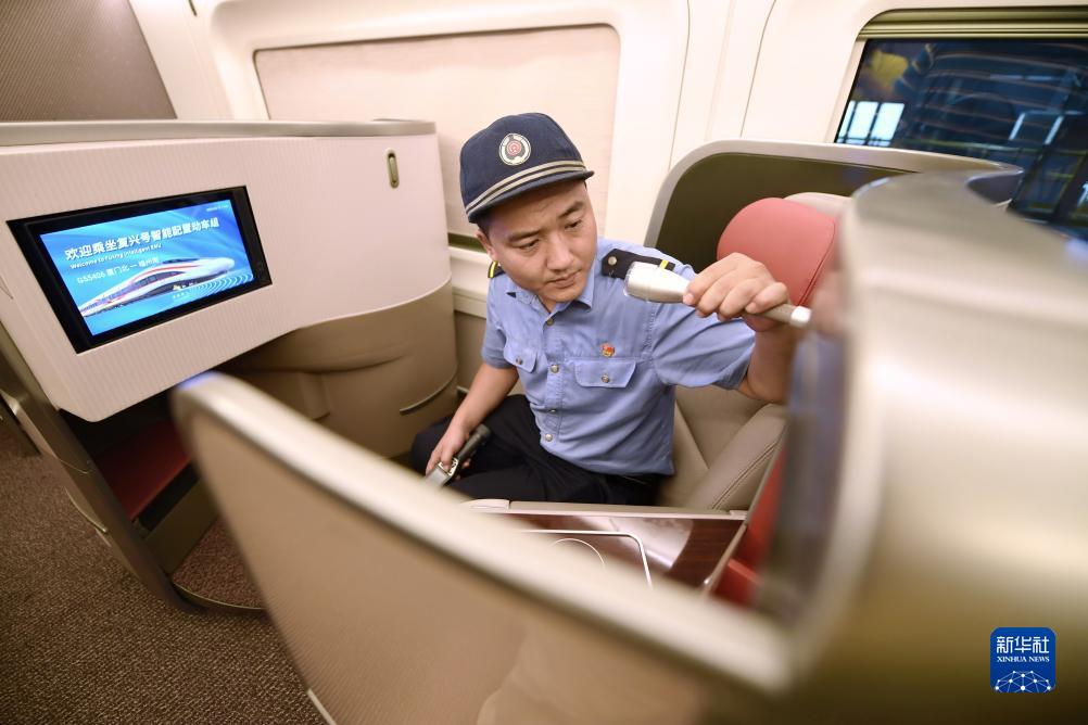 9月13日,高春成在復興號智能配置動(dòng)車(chē)組商務(wù)艙內檢查設備。