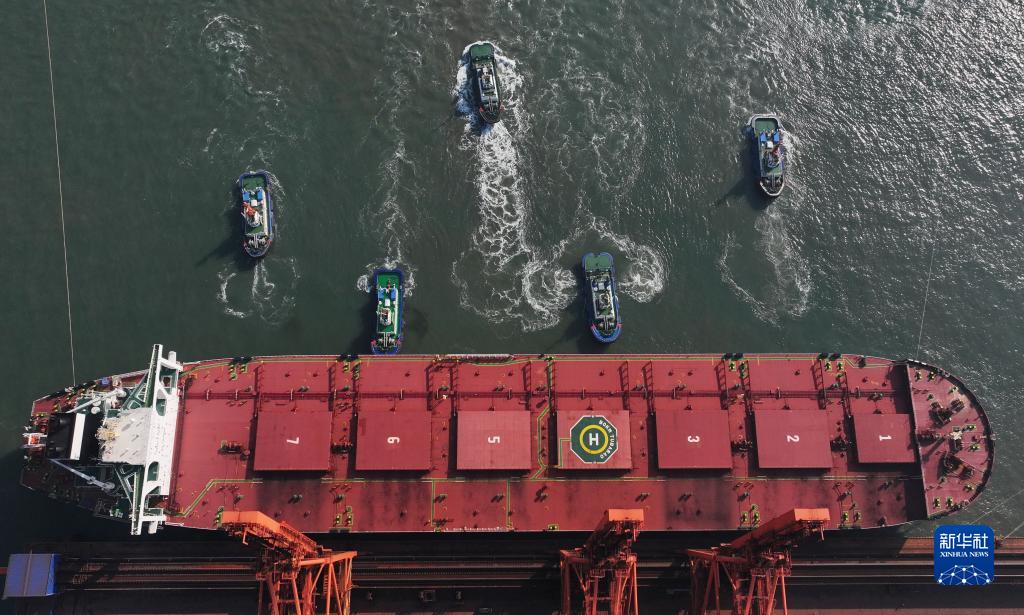 9月16日,一艘輪船在拖輪協(xié)助下準備駛離唐山港曹妃甸港區礦石碼頭(無(wú)人機照片)。