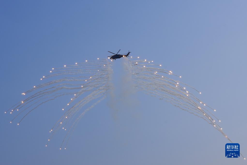 9月16日,陸軍“風(fēng)雷”飛行表演隊直-20戰術(shù)通用直升機發(fā)射干擾彈。