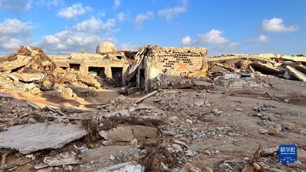 這是9月16日在利比亞德?tīng)柤{拍攝的建筑廢墟。