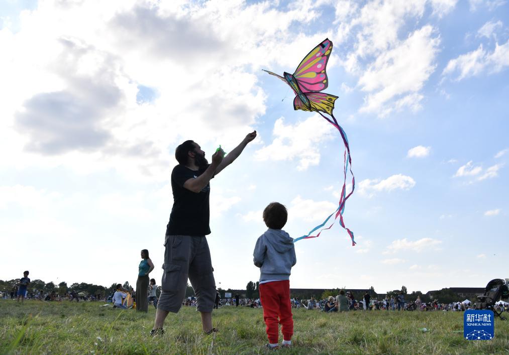 9月16日,在德國柏林,一名男子和孩子一起放風(fēng)箏。