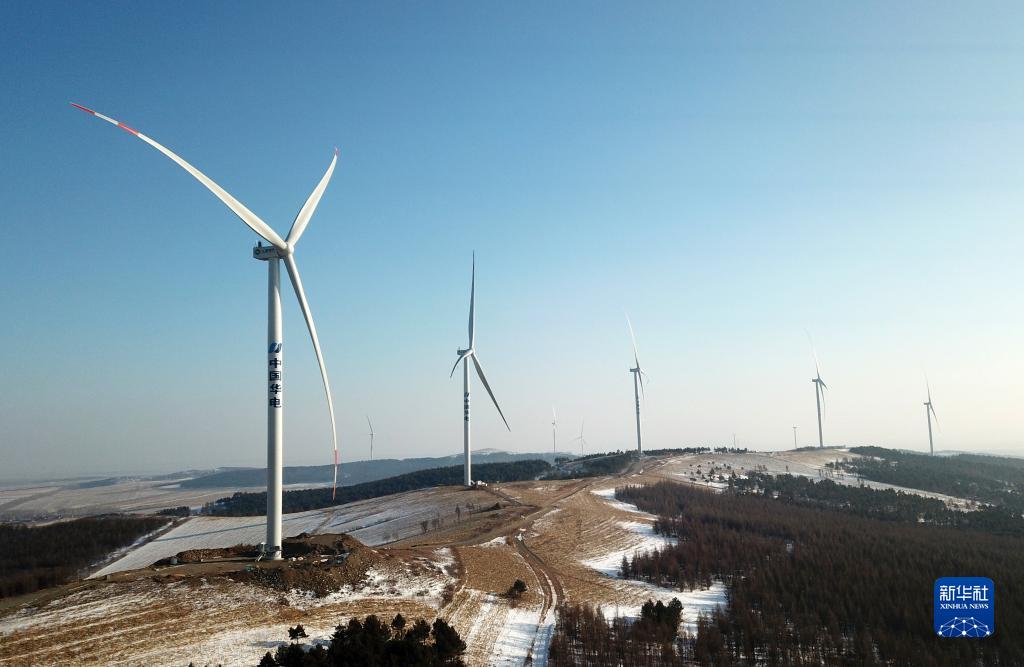 這是華電黑龍江區域哈爾濱依蘭雞冠山風(fēng)電場(chǎng)三期工程部分運行的風(fēng)電機組(2023年2月7日攝,無(wú)人機照片)。