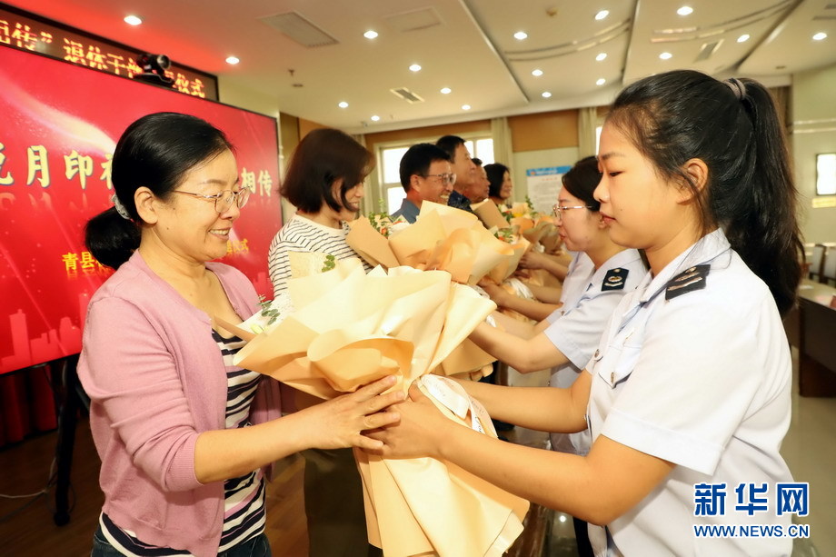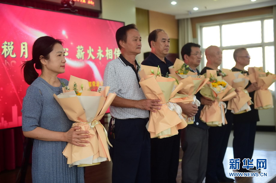 9月15日,國家稅務(wù)總局青縣稅務(wù)局的年輕稅務(wù)干部為退休的老稅官們獻花。新華網(wǎng)發(fā)(巴芳 攝)