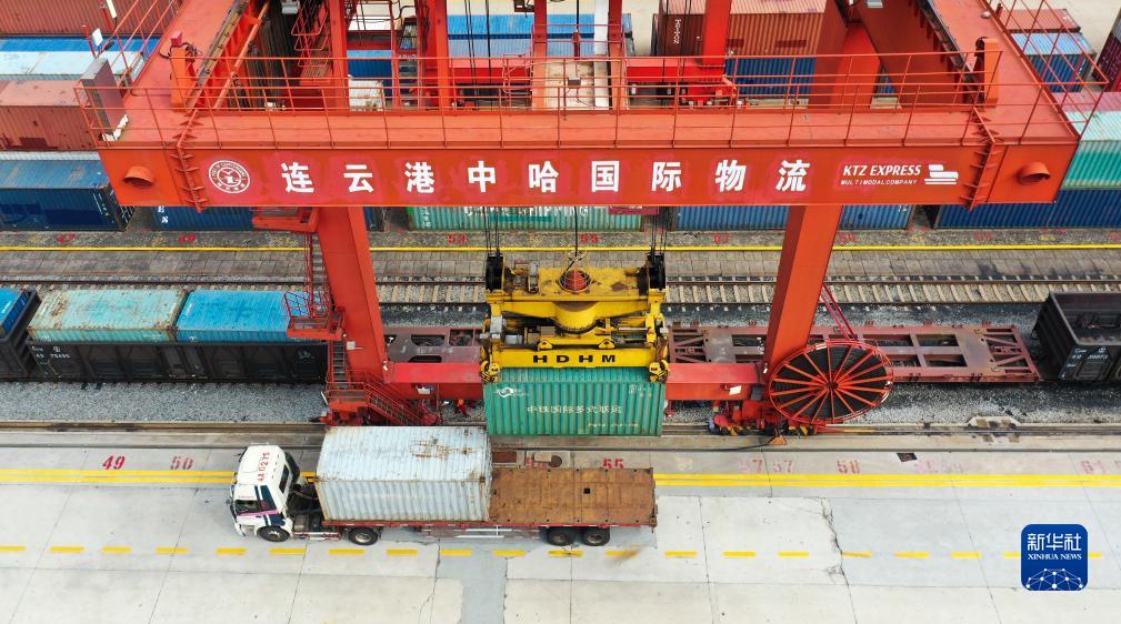 9月16日,在位于江蘇連云港的中哈連云港物流合作基地,龍門(mén)吊在進(jìn)行卸車(chē)作業(yè)(無(wú)人機照片)。