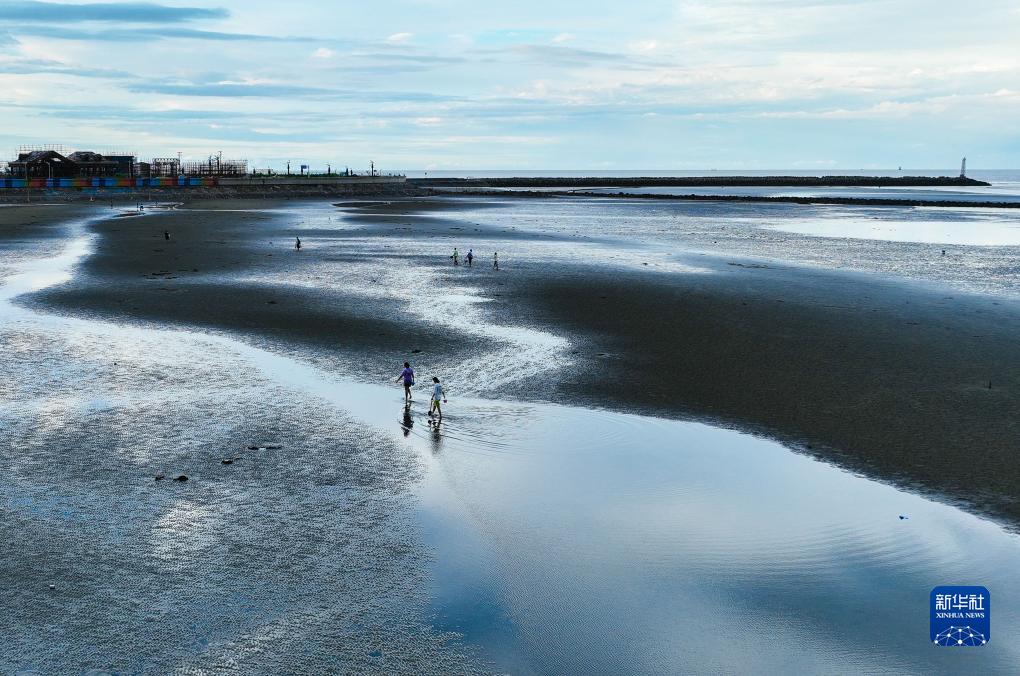 9月16日,游客在啟東“十里海灣”灘涂上游玩(無(wú)人機照片)。