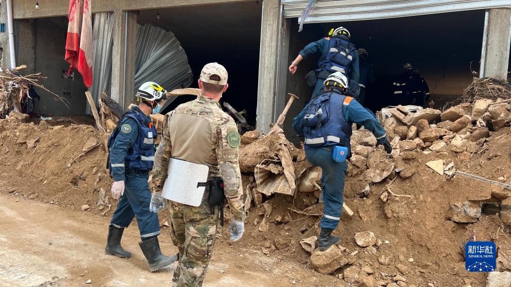 9月17日,國際救援人員在利比亞德?tīng)柤{的建筑廢墟上工作。