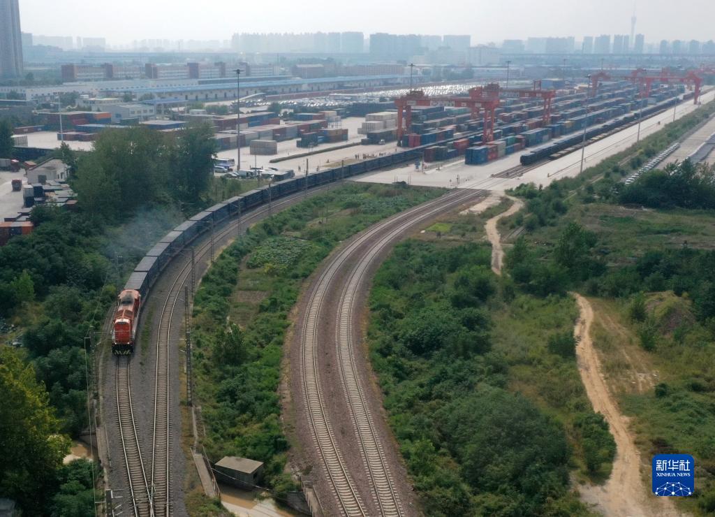 9月17日,X8202次中歐班列(鄭州)駛出國鐵集團鄭州局圃田車(chē)站(無(wú)人機照片)。