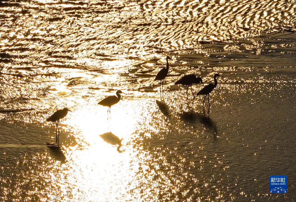鳥(niǎo)兒棲息在鹽城東臺條子泥濕地灘涂(2023年9月1日攝,無(wú)人機照片)。