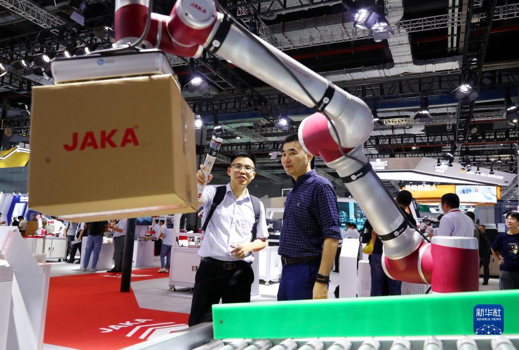 9月19日,參觀(guān)者在一個(gè)進(jìn)行搬運作業(yè)演示的機器人旁交流討論。