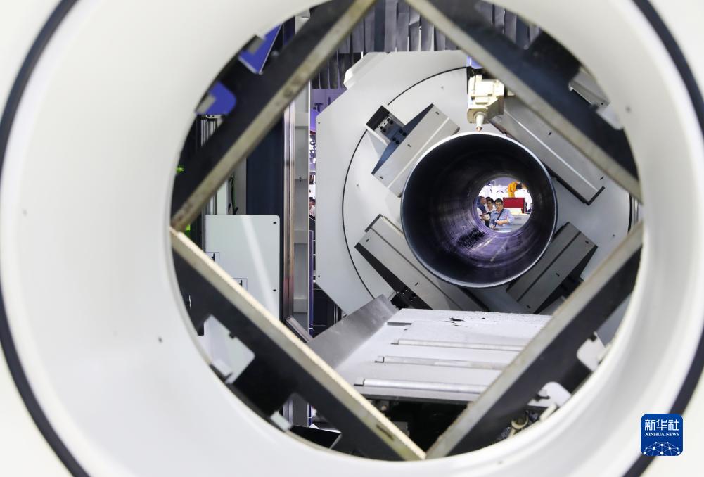 9月19日,參觀(guān)者在一臺進(jìn)行作業(yè)演示的全游離重型坡口切管機前駐足觀(guān)看。
