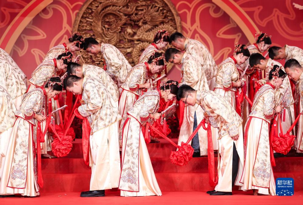 9月19日,在成達萬(wàn)高速鐵路蓬安縣燕山寨隧道口的施工現場(chǎng),新人在集體婚禮上行合巹禮。