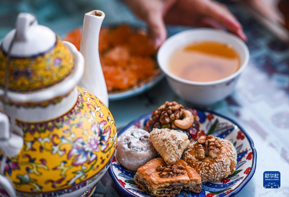 在新疆喀什古城百年老茶館內,茶客在品嘗特色茶飲和茶點(diǎn)(9月15日攝)。