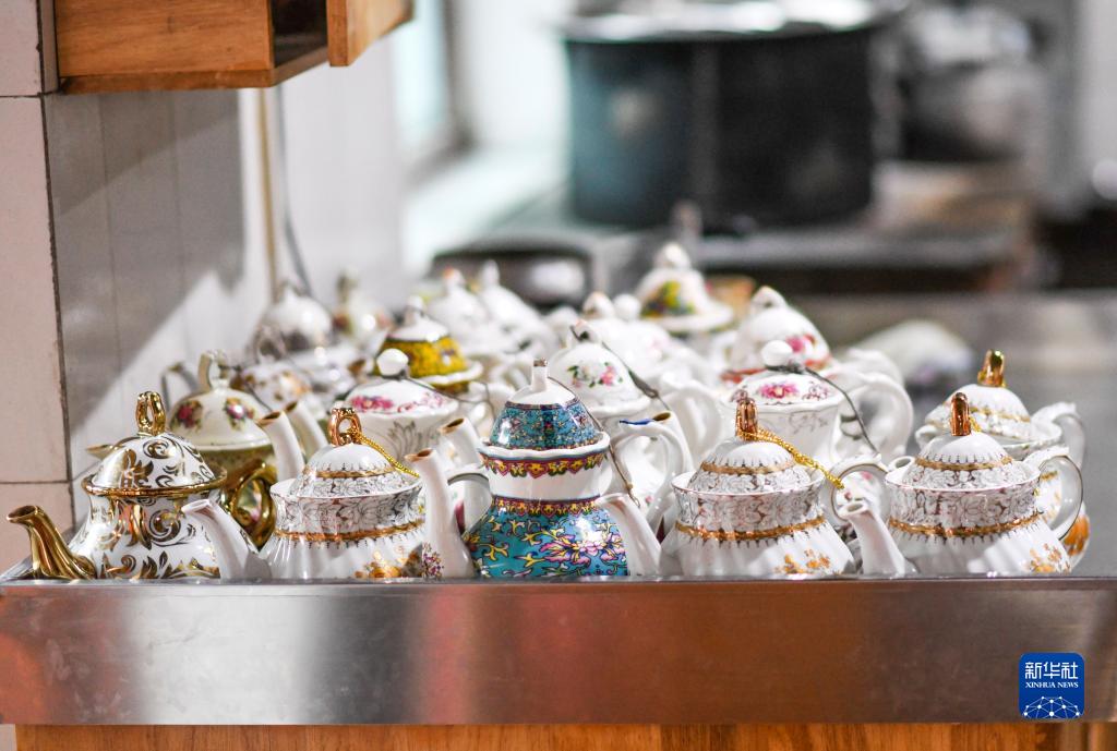 在新疆喀什古城百年老茶館內,工作臺上整整齊齊擺放著(zhù)茶壺(9月15日攝)。