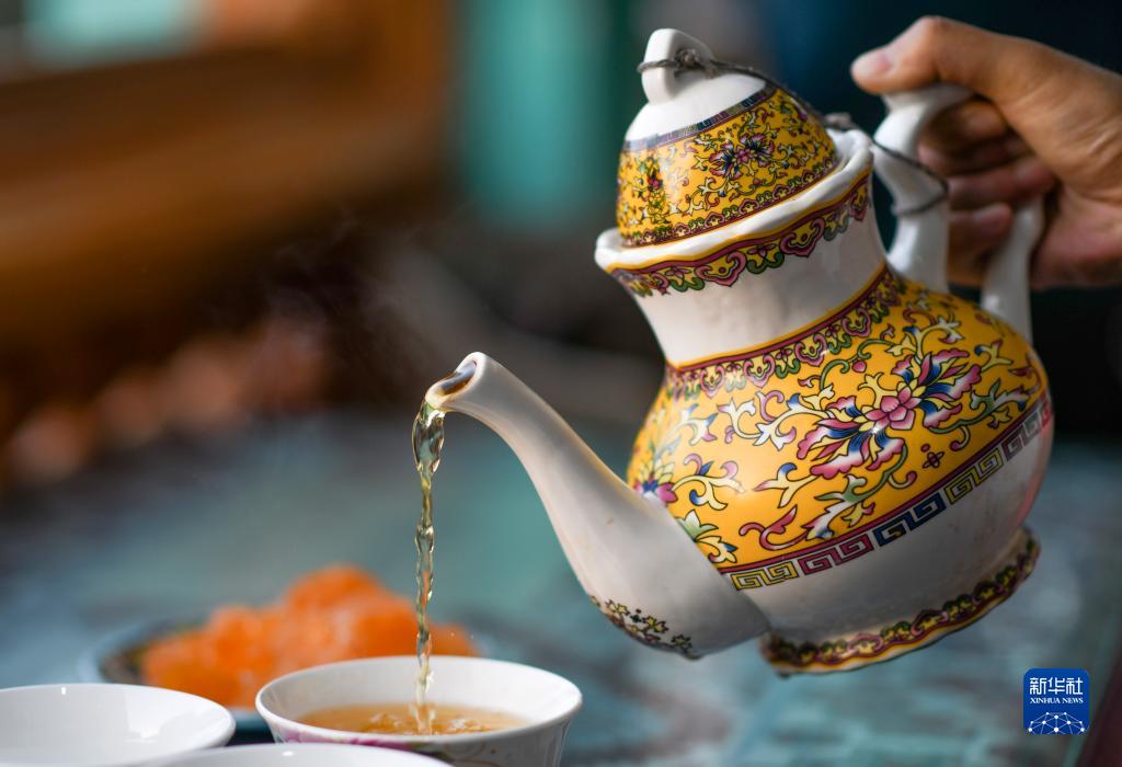 在新疆喀什古城百年老茶館內,一名游客在斟茶(9月15日攝)。