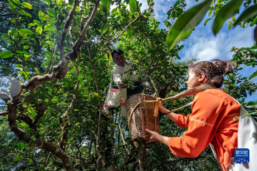 9月19日,景邁山翁基古寨的布朗族茶農哎少(左)將采摘的秋茶放入竹簍。