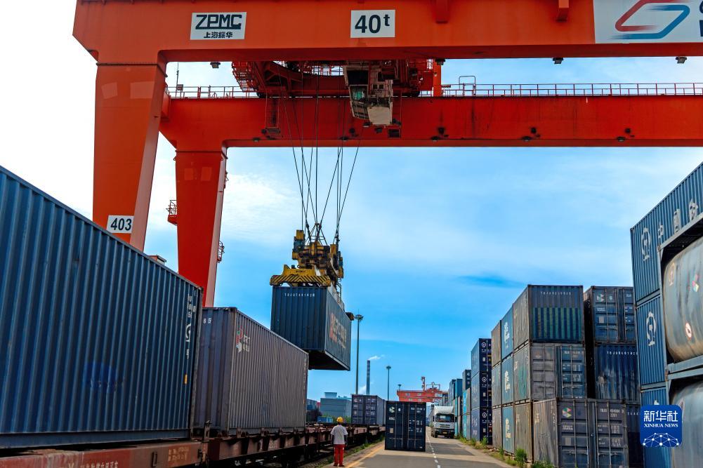 在大連市金港站,中國鐵路沈陽(yáng)局集團有限公司工作人員使用龍門(mén)吊進(jìn)行中歐班列裝車(chē)作業(yè)(6月27日攝)。
