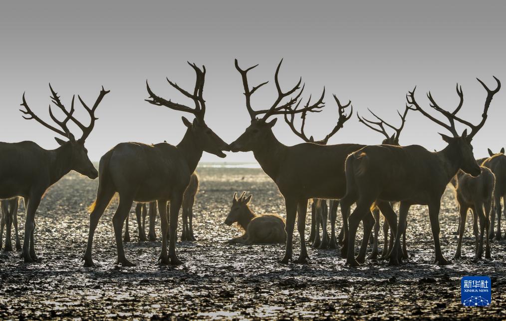 大豐麋鹿國家級自然保護區野外生活的麋鹿種群(8月21日攝)。