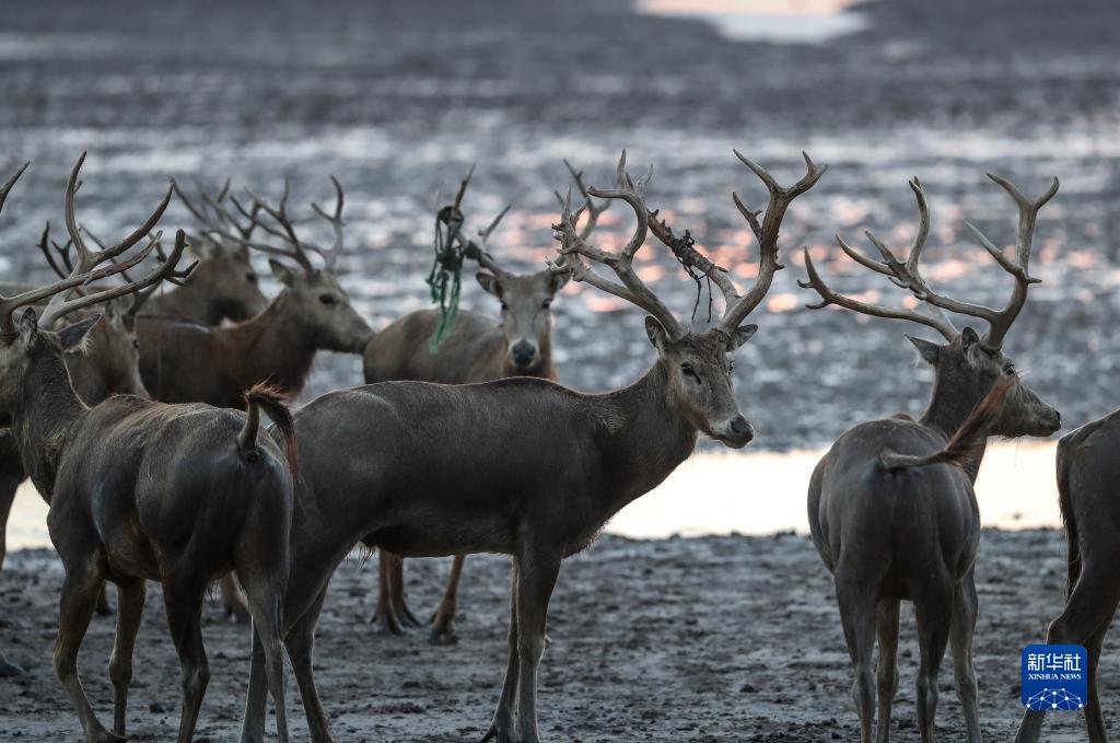 大豐麋鹿國家級自然保護區野外生活的麋鹿種群(8月21日攝)。