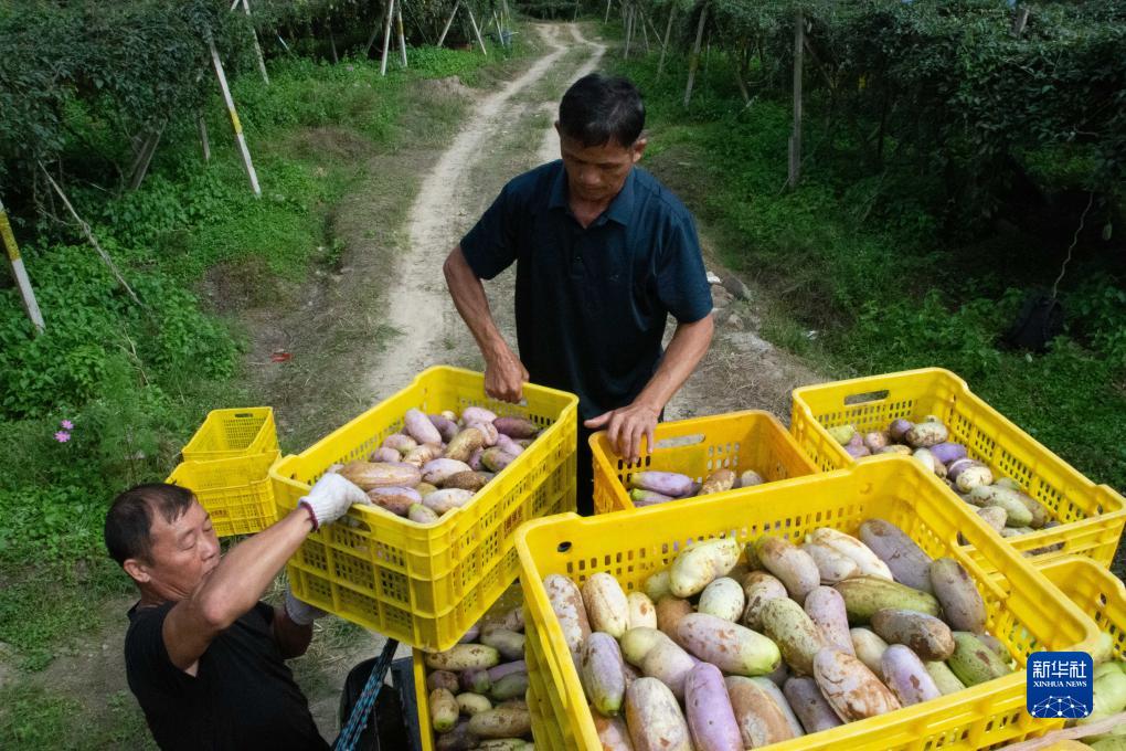 9月20日,湖南省永州市藍山縣所城鎮高良頭村八月瓜種植基地,當地果農將八月瓜裝車(chē)。