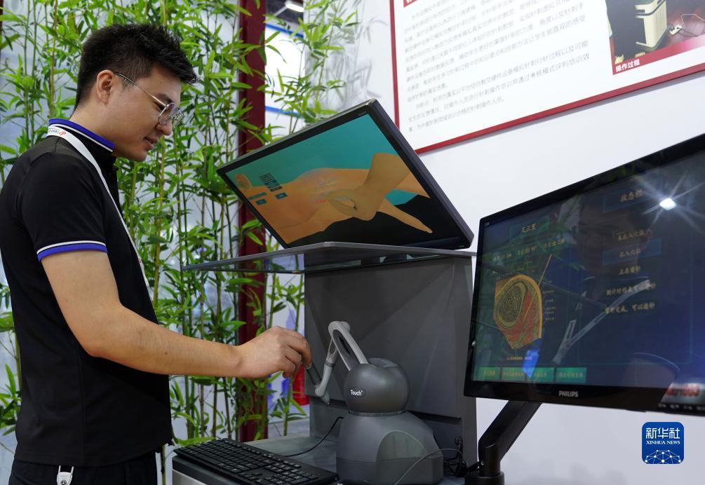 9月19日,上海中醫藥大學(xué)的展臺工作人員展示針刺手法虛擬觸覺(jué)仿真實(shí)訓系統。