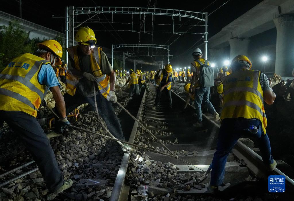 9月19日夜晚,施工人員在滬昆鐵路上海七寶至春申段線(xiàn)路上作業(yè)。