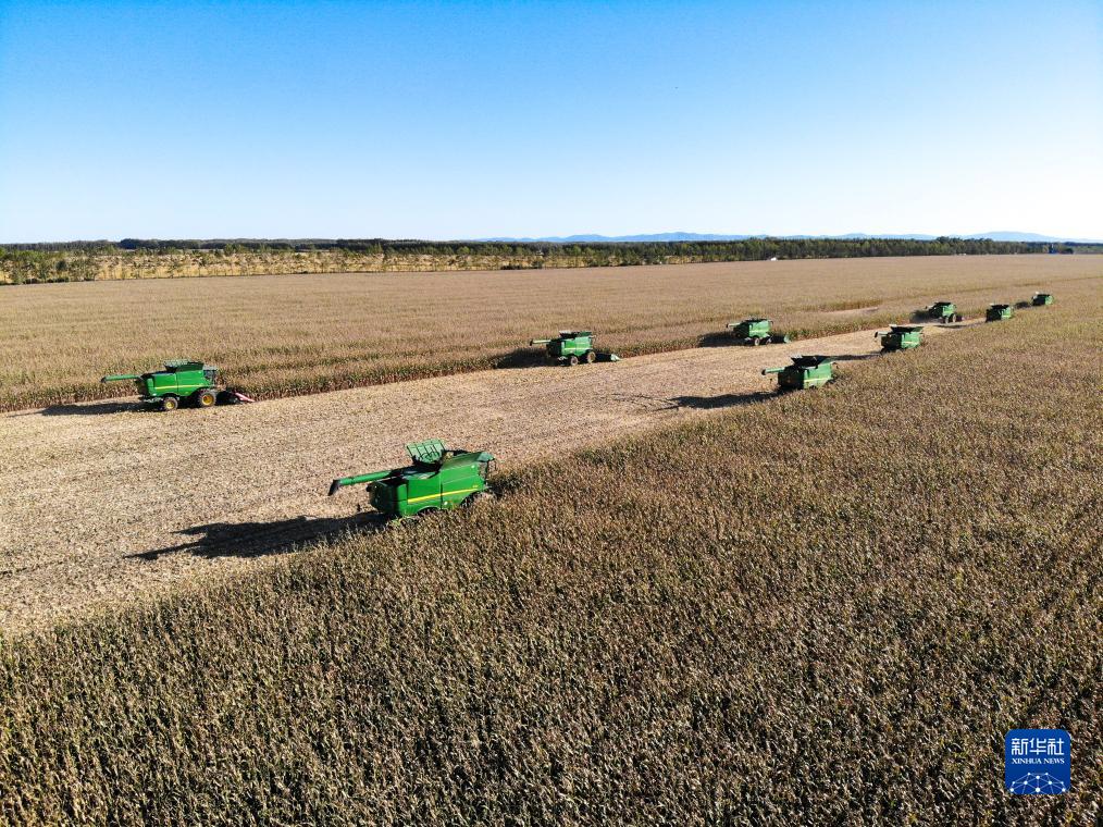 這是9月20日在北大荒農業(yè)股份有限公司友誼分公司一玉米種植地塊拍攝的秋收現場(chǎng)(無(wú)人機照片)。