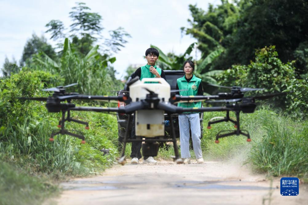 9月13日,位于廣州市增城區石灘鎮石湖村一處機耕路上,沈笑芬(右)操作農用無(wú)人機起飛。